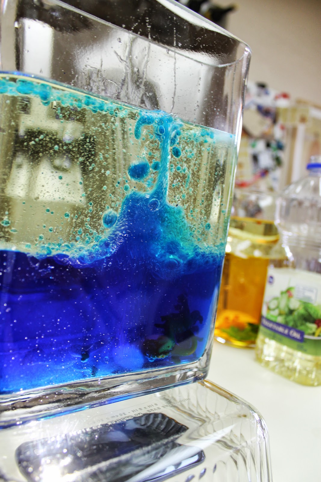 Next we tossed in some dinosaurs. It was pretty cool to watch because they got coated in the oil and made little oily streaks and tunnels in the water.